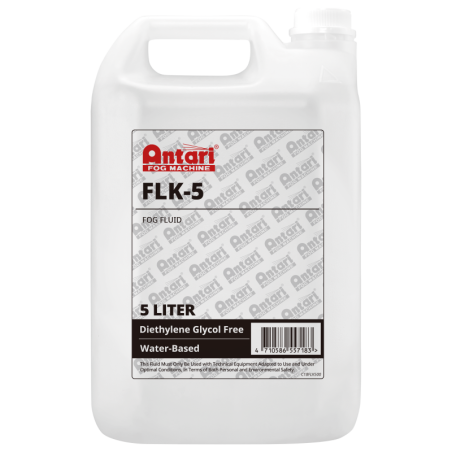5 liter - hoge dichtheid. De Antari FLK-5 Fog Fluid is een op water gebaseerde rookvloeistof die een dichte mist produceert die snel verdampt. Hij is ontworpen voor de Antari J-100 Stage Fog Jet en de Antari DNG-50 Low Fog Machine. Alle ingrediënten die gebruikt worden in Antari vloeistoffen zijn onschadelijk en vallen niet onder de CLP-verordening.
