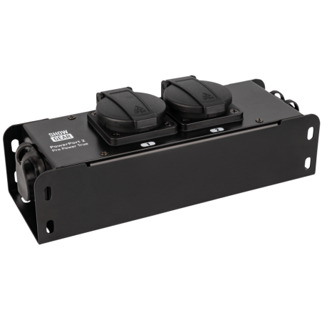 Power Pro True. De Powerport 2 Power Pro True is een eenvoudige stekkerdoos in een metalen behuizing met IP20-classificatie. Hij heeft Power Pro True in- en uitgangsaansluitingen aan weerszijden voor serieschakeling, beide compatibel met de gangbare merken, en beschikt over twee Schuko-stopcontacten. Twee M10-gaten met schroefdraad kunnen worden gebruikt voor de bevestiging van een klem en een veiligheidsoog.