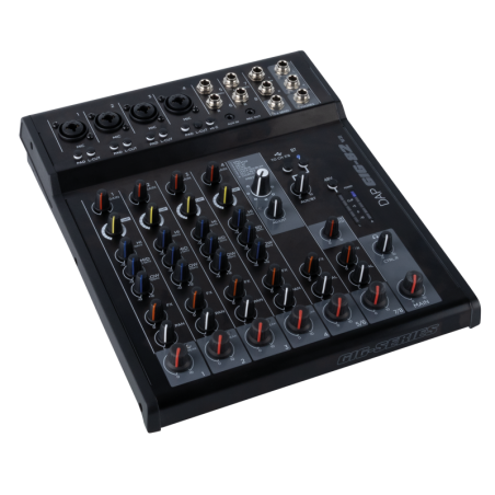 Hij beschikt over vier combi XLR/jack-ingangen met een microfoonvoorversterker, -20 dB pad-schakelaar, 48 V fantoomvoeding en low-cut filter. Kanaal 4 heeft een Hi-Z-modus, waardoor instrumenten zoals elektrische gitaren rechtstreeks kunnen worden aangesloten. Alle vier de monokanalen hebben gainregeling, compressor, 3-bands EQ, FX-sendknop, balansregeling, mixniveauknop en LED-clip-indicatoren. Kanalen 5/6 en 7/8 hebben stereo line-level ingangen via dubbele 6,3 mm-jacks, elk met FX-sendniveau, balans- en mixniveauregeling. Extra ingangen zijn onder meer een 3,5 mm Aux-minijack en BT-connectiviteit, die een niveauregeling delen.