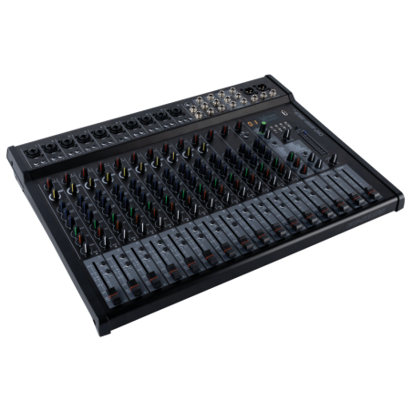 Hij beschikt over 10 XLR/jack combo-ingangen met een microfoonvoorversterker, -20 dB pad-schakelaar, 48 V fantoomvoeding en low-cut filter. Kanaal 10 heeft een Hi-Z-schakelaar, waardoor instrumenten zoals elektrische gitaren rechtstreeks kunnen worden aangesloten. Alle zes monokanalen beschikken over gain-regeling, compressor, 3-bands EQ, FX- en AUX-sendknoppen, balansregeling, mixniveau-fader en LED-clip-indicatoren. Kanalen 11-16 hebben stereo line-level ingangen via dubbele 6,3 mm jacks, elk met gainregeling, 3-bands EQ, FX- en AUX-sendniveau, balansregeling en mixniveau-fader. Extra ingangen zijn een 3,5 mm Aux-minijack, een USB-mediaspeler en BT-connectiviteit, die allen een gemeenschappelijke volumeregeling hebben.De interne effectengine heeft 24 effecten, zoals reverbs, delays en modulaties, die je op alle kanalen kunt gebruiken, behalve op de 3,5 mm minijack-ingang, BT-ingang en USB-mediaspeler. Voor externe effecten kun je het audiosignaal via de FX Sends-uitgang naar externe apparatuur sturen, met de optie om het bewerkte signaal terug te sturen naar een ongebruikt kanaal. Deze uitgang kan ook als monitor send-bus dienen, wat extra flexibiliteit biedt. Er is een speciale Aux-bus beschikbaar voor het maken van een monitormix, terwijl een stereosubgroep met een eigen fader en uitgang gegroepeerde bediening en parallelle bewerking mogelijk maakt. Alle kanalen, behalve de minijack en USB-mediaspeler, kunnen naar deze subgroep worden gerouteerd. Voor studiogebruik is er een control room-uitgang met aparte volumeregeling die gelijk is aan de hoofdtelefoonuitgang.